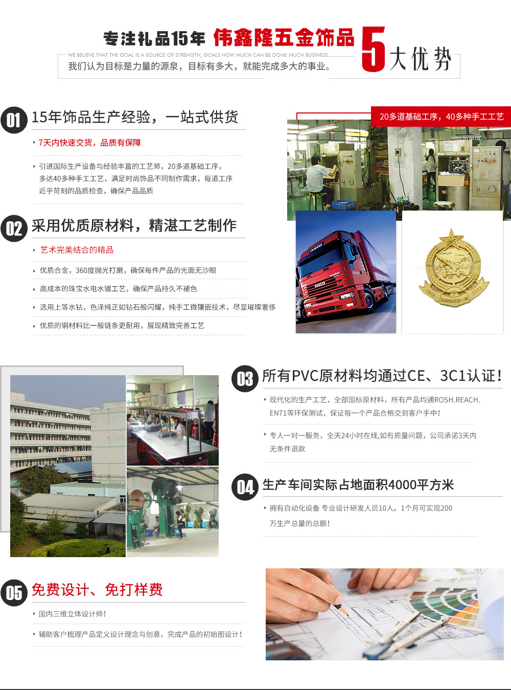 深圳市偉鑫隆五金飾品有限公司位于廣東省深圳市坑梓鎮(zhèn),是一家集設(shè)計(jì)、生產(chǎn)、銷售為一體的專業(yè)五金禮品工藝公司。 公司擁有經(jīng)驗(yàn)豐富的專業(yè)技術(shù)精英團(tuán)隊(duì),至今已有十多年設(shè)計(jì)生產(chǎn)經(jīng)驗(yàn)。 公司自有工廠引進(jìn)先進(jìn)的臺(tái)灣設(shè)備及技術(shù),擁有設(shè)計(jì)、繪圖、制模、沖壓、壓鑄、拋光、電鍍、包裝等生產(chǎn)流程,可生產(chǎn)銅、鐵、不銹鋼、鋁、鋅合金、鉛錫合金等材質(zhì)的金屬徽章、胸針、胸章、獎(jiǎng)?wù)隆ⅹ?jiǎng)牌、金屬標(biāo)牌、工號(hào)牌、金屬鑰匙扣、狗牌、軍牌、開瓶器、金屬手機(jī)吊飾、錢夾、領(lǐng)帶夾、帽夾、項(xiàng)鏈吊墜、掛包鉤、紀(jì)念章、紀(jì)念幣、袖扣、促銷禮品鑰匙扣、書簽、五金配件、開瓶器等旅游紀(jì)念品及工藝禮品五金飾品。我公司還可根據(jù)客戶樣板開模生產(chǎn)。 公司秉承“精...
